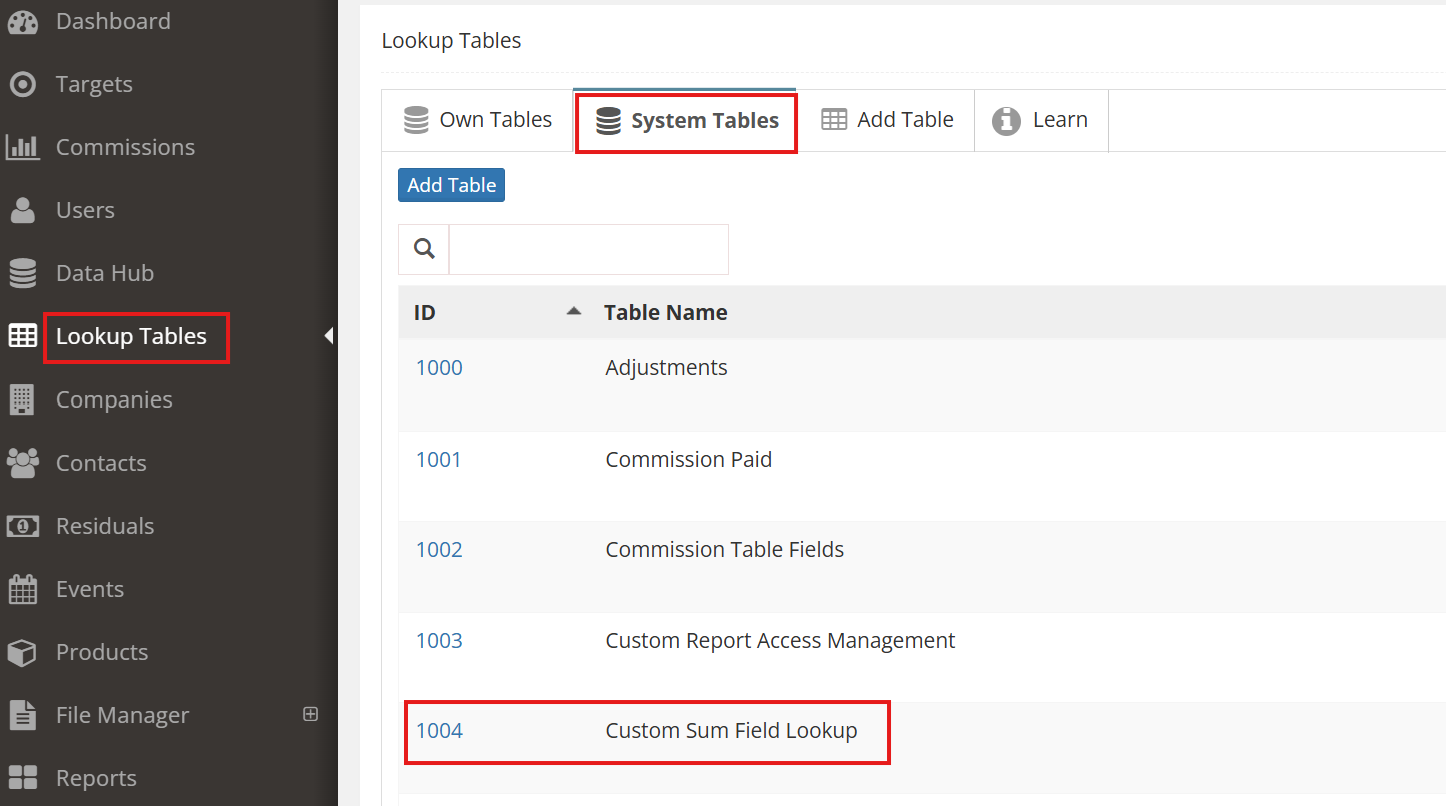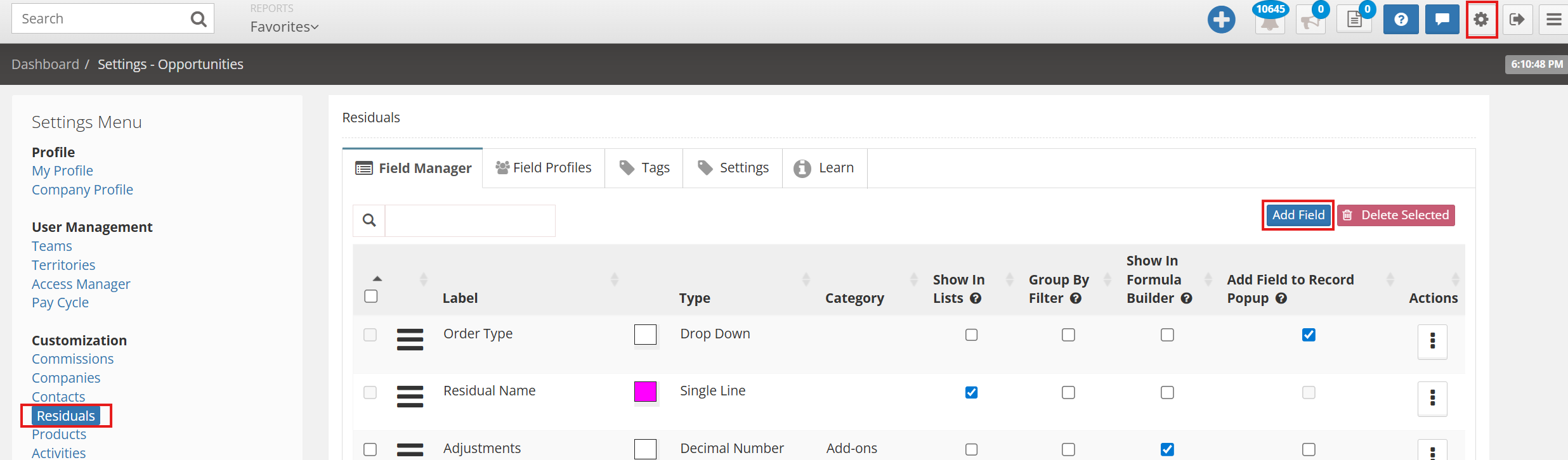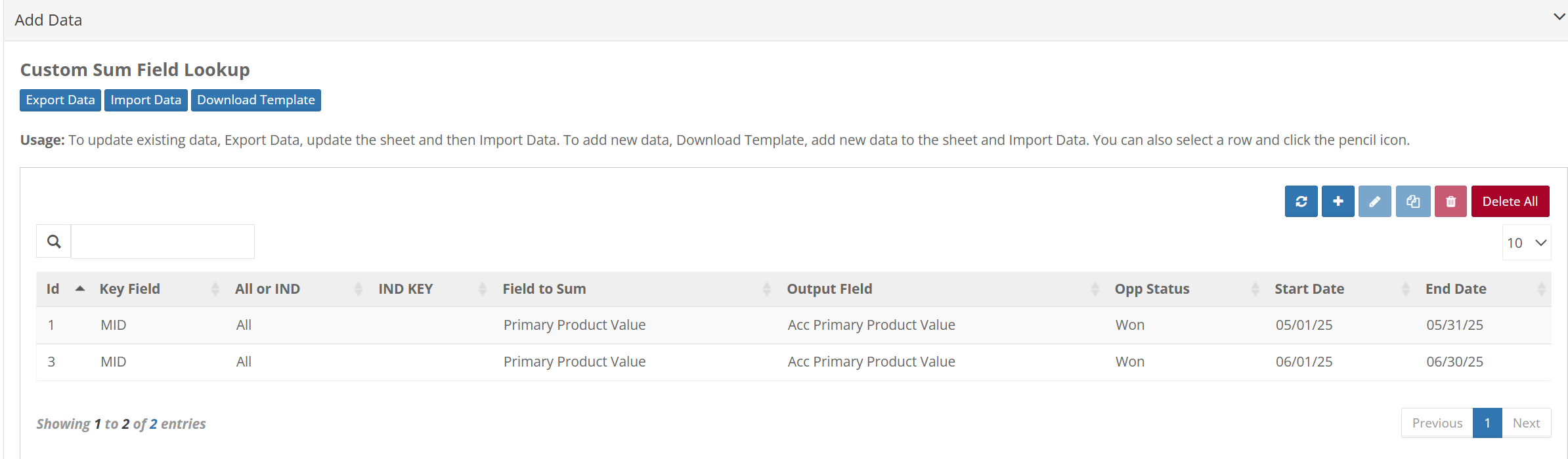The Accumulated Field feature allows the creation of a field that sums values from multiple opportunities (residuals) based on a defined key field. This ensures totals are calculated automatically across records without manual work. The setup is managed through the Custom Sum Field Lookup in System Tables.