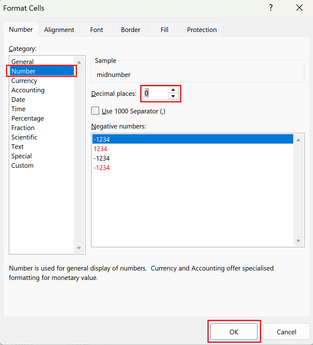 - In Category section, select Number, set Decimal places to 0, then click OK