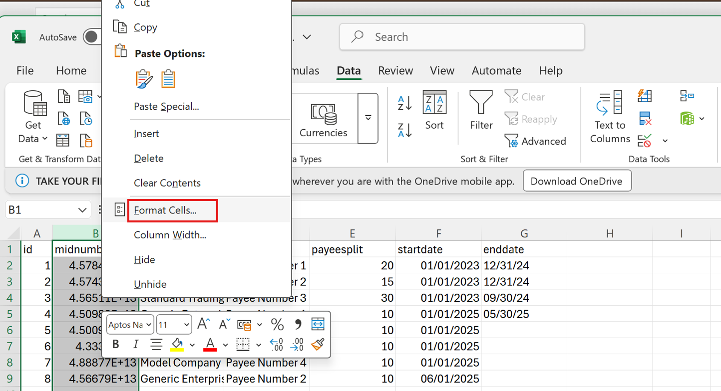 - In Excel, select the column containing the MID, then right-click the mouse and choose Format Cells