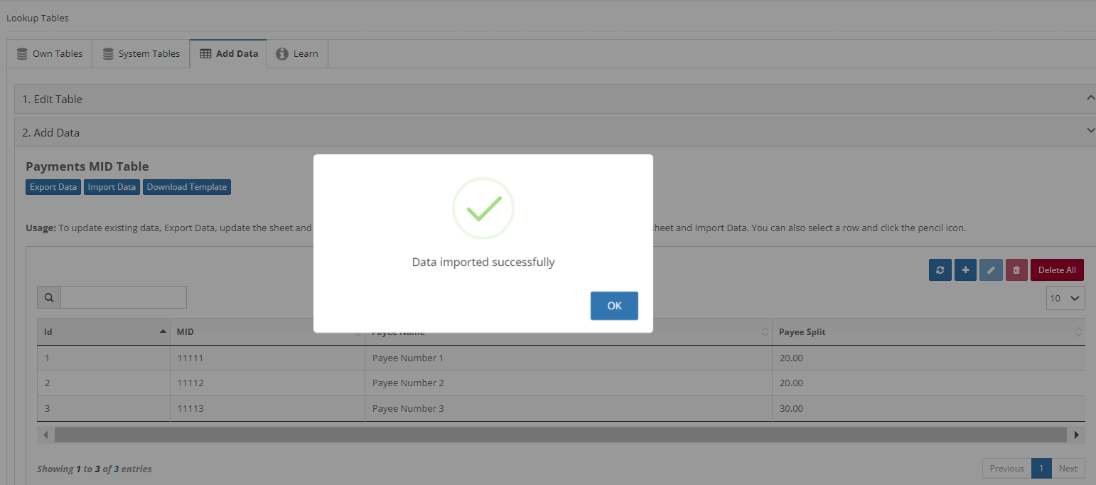 The system incorporates a feature that enables users to preview and edit lookup table MID data before importing, if necessary.